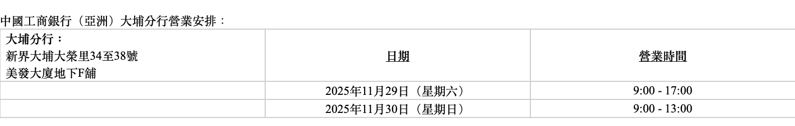 香港新聞網11月28日電 中國工商銀行迅速啟動應急金融服務機制,將捐款1000萬港元支持救災及災後重建。同時,中國工商銀行(亞洲)將實施一系列舉措,包括便捷分行服務、簡易身份認證及即時補辦卡,以及彈性還款方案及相關費用豁免,致力為受影響市民提供適切援助。 分行服務方面,中國工商銀行(亞洲)進一步延長大埔分行於本周末的營業時間,以滿足受大埔火警影響的市民在銀行服務方面的急切需求。三間分行均提供儲備瓶裝水、插電與充電裝置及休息空間,更特別為受影響市民設有專用熱線(852)3510 1282處理緊急金融業務。此外,為配合應急援助金發放安排,進一步加大相關分行的現金庫存,以及確保大埔區與鄰近區域的自動櫃員機現金供應充足,方便受影響市民提取現金。