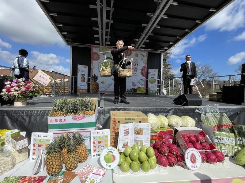 2024年4月15日,台南市農業局長李建裕即以挑伕造型亮相加拿大多倫多,推銷來自台南的芭樂、鳳梨、紅龍果、虱目魚、烏魚子、關廟麵等台灣特色農產品。台灣“中央社”資料圖