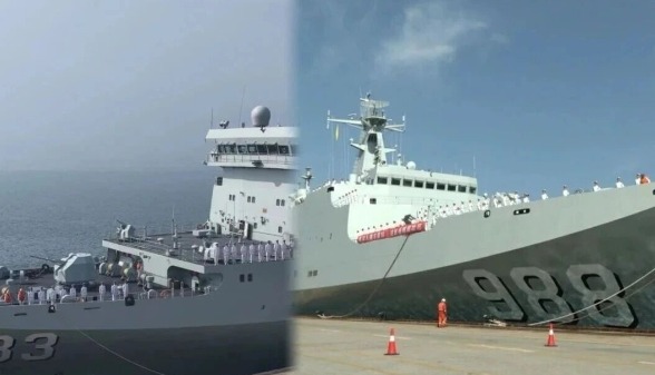 【字幕】導彈驅逐艦“湛江艦”:舷號165,中國自主設計建造的052D型導彈驅逐艦,被稱為“中華神盾”。該型艦隱身性能好、預警能力強,綜合作戰能力突出,是航母編隊的“帶刀侍衛”。