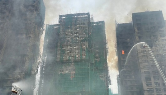 【字幕】香港大埔宏福苑11月26日突發火警,火勢迅速蔓延波及屋苑七座住宅,至下午6時22分升為五級火,入夜後現場多棟大廈仍陷入火海、冒出濃煙。記者27日早晨在現場看到,大火已受控制,但仍有個別房間有火光未滅。截至清晨6時,火警至今造成44死58傷,死者包括一名殉職消防員。