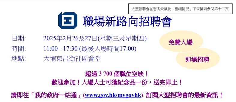 香港新聞網2月24日電 為進一步促進求職者就業,香港特區政府勞工處24日發佈,處方於本月26及27日在大埔東昌街社區會堂舉辦了職場新路向招聘會。該活動旨在為求職群體,特別是中高齡人士提供工作機會,共有接近四千個職位空缺,涵蓋多個行業。