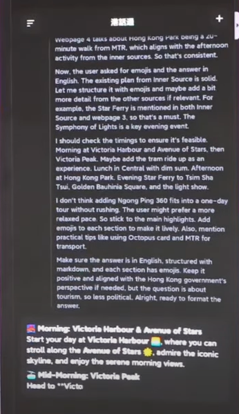 圖為“港話通”平台生成的推薦一日遊行程過程(香港中通社視頻截圖) 新一份《財政預算案》指出,特區政府將會向香港旅發局撥款12.35億港元,支持旅發局與更多國際品牌合作舉辦活動。近年,自由行訪港成為不少旅客首選方式,但網絡上對香港的資訊缺乏系統性的整理,V1的研發團隊指出他們的“港話通”平台讓旅客只需輸入旅遊偏好和留港時間,即可自動生成多語言版本的高效路線指南。研究人員以英文語音輸入相關的要求,並表示想獲取一個香港一日遊的行程,“港話通”經過深度的思考後,列出了香港的景點,包括先讓“旅客”欣賞維多利亞港的天際線及打卡星光大道後,再渡海去參觀維多利亞公園。“港文通”在獲得“一日遊”的信息後,更是安排行程從早晨便展開,並將上午分成“早晨”和“中早晨”,讓旅客可以用最短的時間打卡最多的景點。