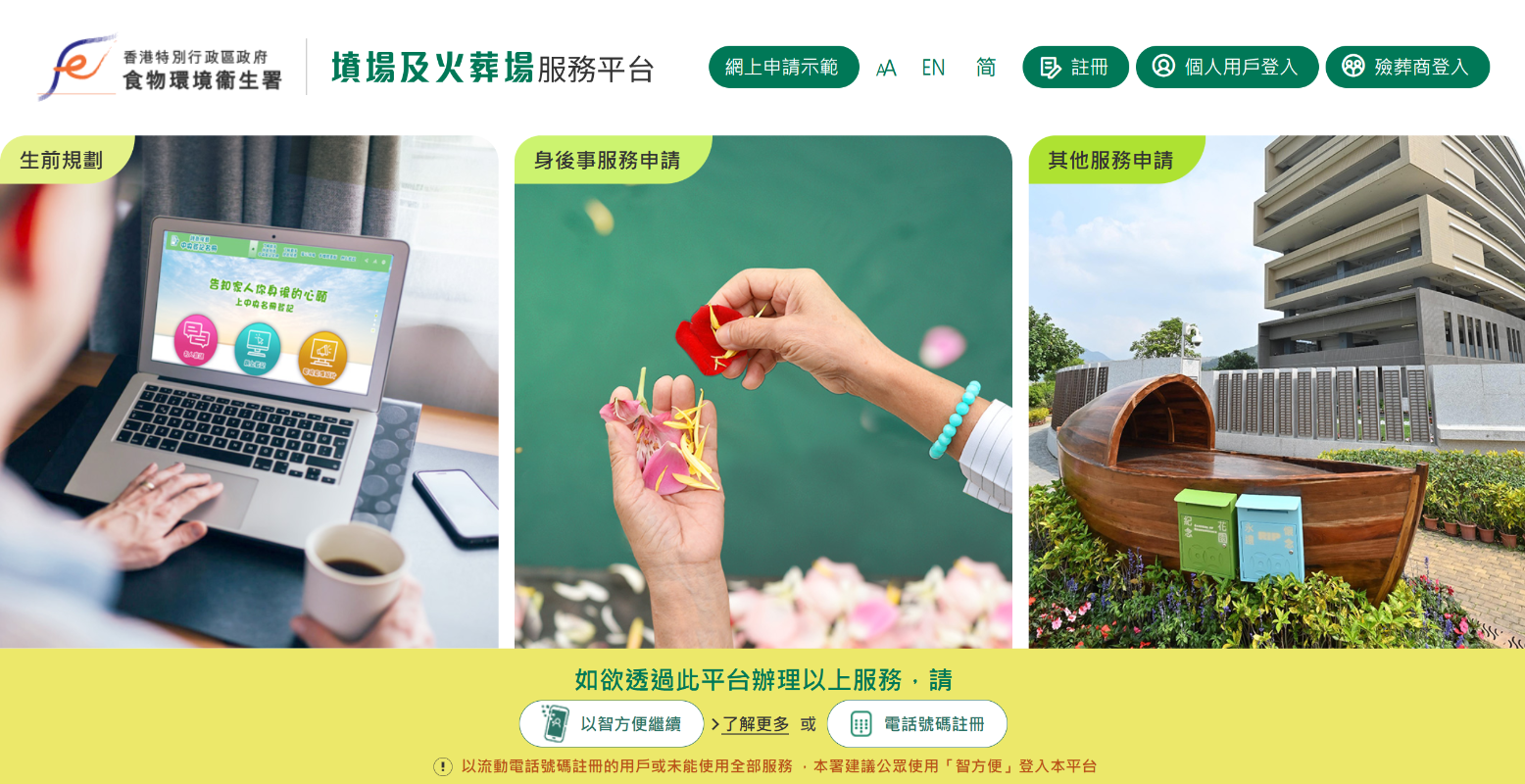 墳場及火葬場服務平台網站截圖 市民即日起可於該服務平台提交所有由署方管理的墳場及火葬場服務的申請,包括火葬服務、公眾骨灰龕位編配、墳場服務、綠色殯葬、流產胎火化或安放、免費海上追思活動及建立“無盡思念”網站(預早規劃篇)。服務平台特設一項功能,讓市民可在網上設立綜合服務戶口,統一管理多位先人的身後事安排,減省手續,更可在單一帳戶內管理同一位先人的多項服務申請,即時掌握各項服務的申請進度。 網上平台同時支援多種電子支付方式,省卻市民親自前往墳場及火葬場辦事處辦理手續和繳付服務費用的時間。 申請人須通過服務平台預先登記及完成認證,方可使用服務平台申請墳場及火葬場服務。食環署鼓勵市民使用“智方便”電子身份驗證,系統將自動填寫部分網上表格,加快申請流程。(完) 【編輯:梁嘉軒】