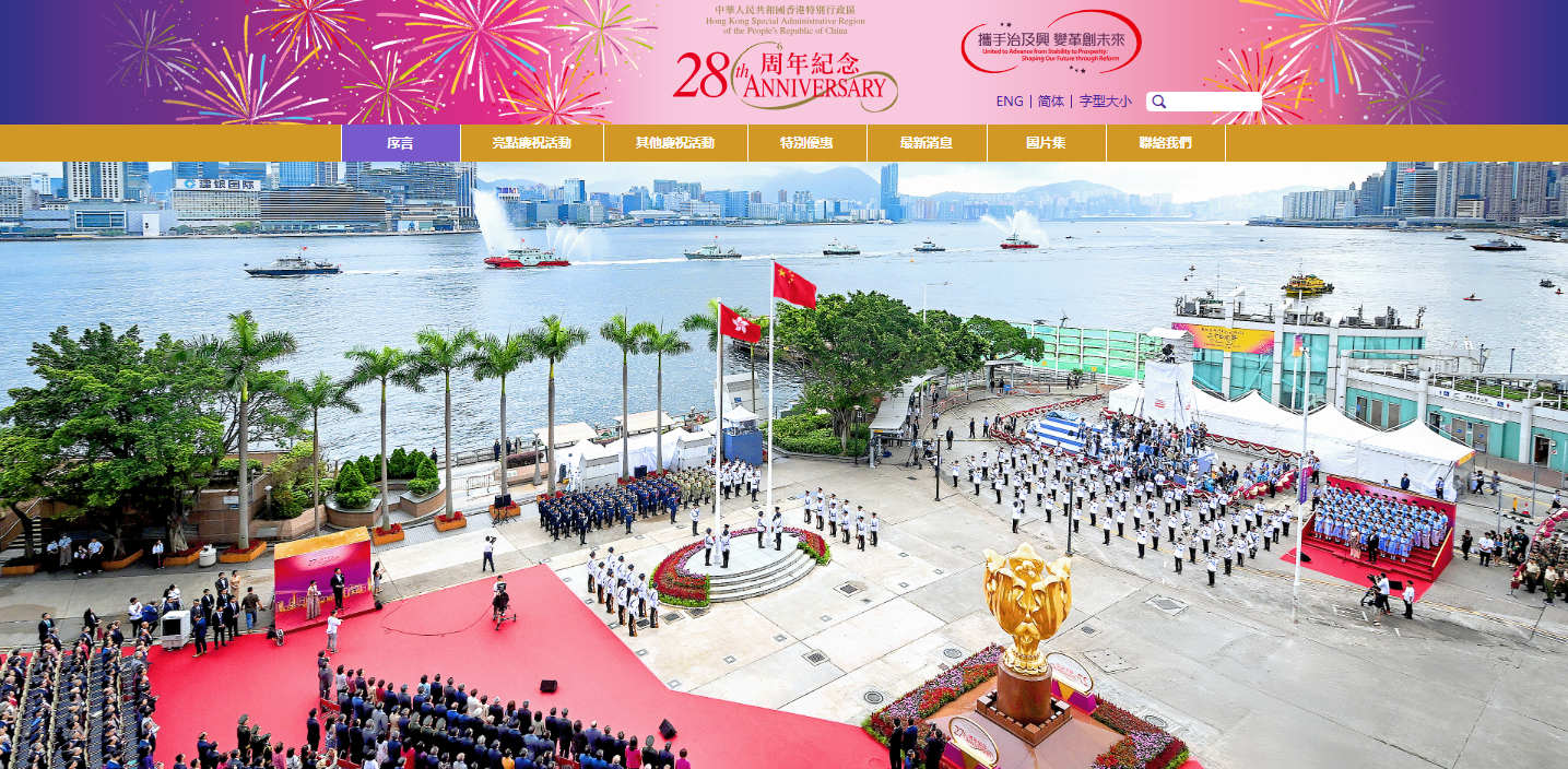 特區政府專題網頁截圖 社會賢達及制服團隊成員會出席儀式,現場不會設立公眾觀禮區。升旗儀式中,警察樂隊將會奏樂;在歌唱家男高音陳永和女高音宋元明的領唱下,金文泰中學合唱團會獻唱國歌;特區政府紀律部隊會在空中和海上敬禮。 升旗儀式結束後,特區政府會在會展三樓大會堂舉行慶祝酒會,行政長官將為酒會主禮。(完) 【編輯:梁嘉軒】
