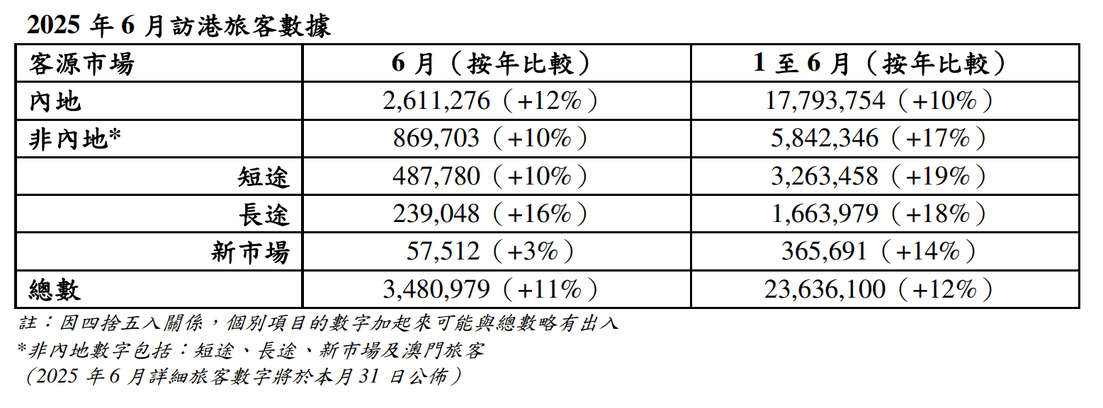 香港新聞網7月26日電 香港旅遊發展局26日公佈,6月訪港旅客數字為348萬人次,較去年同期上升11%。累積計算,今年上半年共錄得約2400萬訪港旅客人次,按年增加12%。