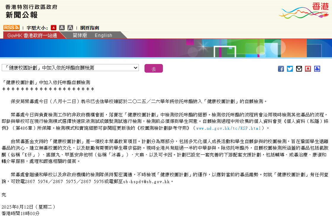 香港新聞網8月12日電 香港特區政府保安局禁毒處12日表示,已去信學校確認於2025/26學年將依托咪酯納入“健康校園計劃”的自願檢測。