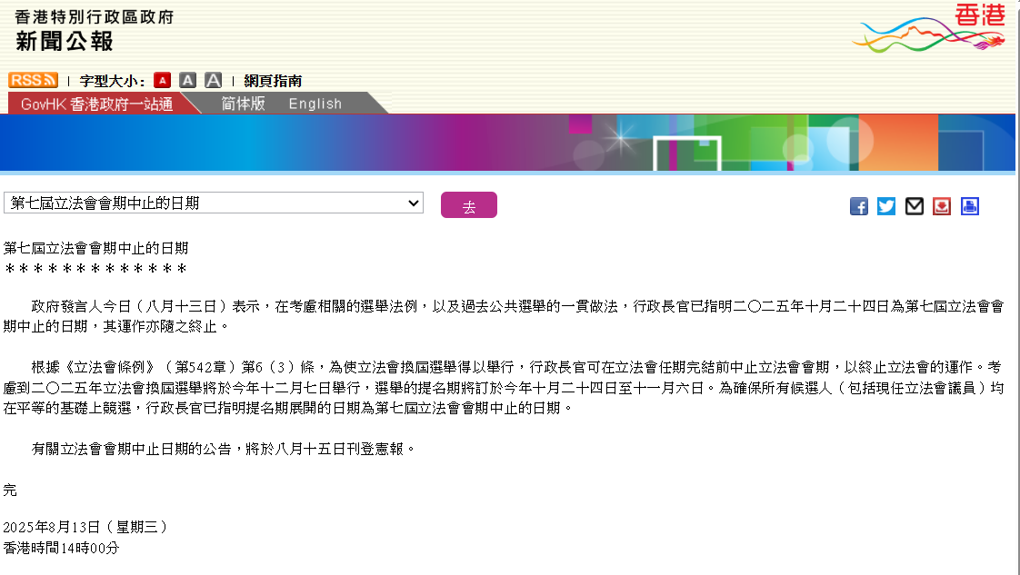 根據《立法會條例》,為使立法會換屆選舉得以舉行,特區行政長官可在立法會任期完結前中止立法會會期,以終止立法會的運作。考慮到今年立法會換屆選舉將於12月7日舉行,選舉的提名期將訂於今年10月24日至11月6日。 為確保所有候選人(包括現任立法會議員)均在平等的基礎上競選,特區行政長官已指明提名期展開的日期為第七屆立法會會期中止的日期。有關公告將於8月15日在憲報刊登。(完) 【編輯:譚暢】