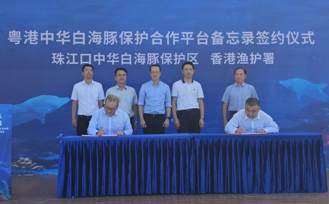 圖源:政府新聞處 在漁護署副署長黎存志及廣東省林業局副局長吳曉謀等人見證下,漁護署助理署長(漁業及海洋護理)朱振華博士與廣東珠江口中華白海豚國家級自然保護區管理局局長張朝明今日在珠海舉行的粵港澳大灣區中華白海豚保護宣傳活動上簽署《合作備忘錄》。 《合作備忘錄》旨在貫徹落實《粵港澳大灣區發展規劃綱要》有關共同推進大灣區生態保護一體化建設的建議。中華白海豚保護合作平台以香港特區去年設立的北大嶼海岸公園和毗鄰的廣東珠江口中華白海豚國家級自然保護區為基礎,協同兩地在中華白海豚生態監測與研究、保護區管理監控、海洋保育教育等範疇的合作,為共同保護中華白海豚邁出重要的一步。 (完) 【編輯:譚暢】
