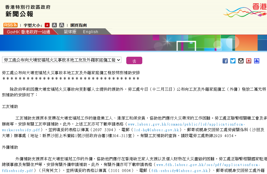 香港勞工處向大埔火災受災工友及外傭發放2萬港元特別補助分享到: