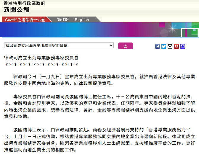 圖片來源:政府新聞處網站截圖 專家委員會由律政司副司長張國鈞擔任主席,13名成員來自中國內地和香港的法律、金融和會計界別專家,以及優秀的商界和企業代表,任期兩年。專家委員會將就加強了解內地出海企業的需求,統籌香港法律、會計、金融等專業服務界別支援內地企業出海方面提供意見和協助。 張國鈞表示,由律政司推動發起、商務及經濟發展局支持的“香港專業服務出海平台”上月13日正式啟動,標誌香港專業服務協同支援內地企業出海邁向新階段。律政司成立出海專業服務專家委員會,匯聚各專業服務界別人士出謀獻策,支援和推廣平台的工作,更好推進協助內地企業出海的相關工作。(完) 【編輯:林曉惠】