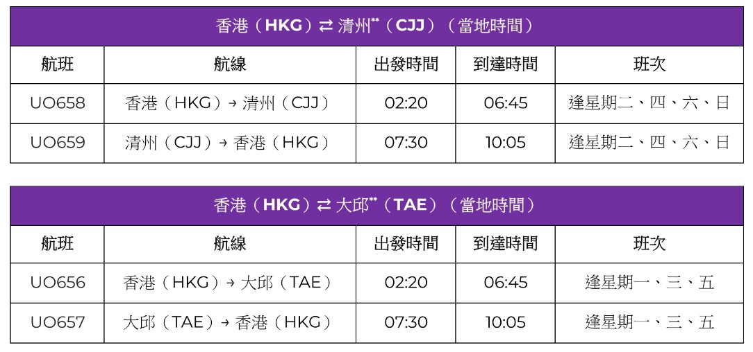 香港新聞網3月14日電 香港快運航空(香港快運)今日(14日)推出兩條全新韓國航線。香港快運將分別於6月5日及6日開通直飛清州國際機場(CJJ)和大邱國際機場(TAE)的航線,帶領大家深入韓國中南部,探索豐富的文化遺產和自然美景,並朝聖韓劇熱門拍攝熱點,滿足旅客各式各樣的需求。 為慶祝全新的清州和大邱航線,香港快運推出韓國五大航點限時優惠,清州、大邱、首爾、釜山及濟州“經濟飛”單程票價低至港幣108元*(包括一件隨身物品及一件登機行李)!立即行動,於3月14日上午11時00分至3月16日晚上11時45分期間登入香港快運官網或使用手機應用程式預訂五大航點的優惠機票,盡情去飛,享受韓國的無限魅力!航點適用旅遊日期如下: · 清州:2025年6月5日至10月25日 · 大邱:2025年6月6日至10月24日 · 首爾、釜山、濟州:2025年3月24日至2025年10月25日
