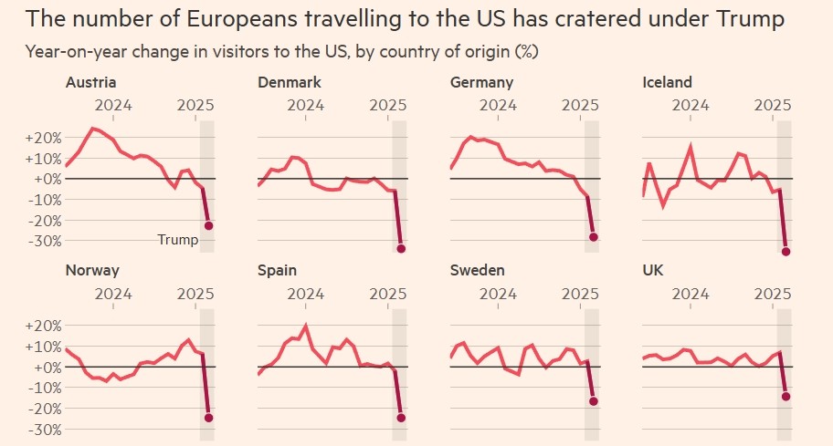 數據顯示,歐洲國家赴美旅遊人數大幅下降。英國《金融時報》製圖