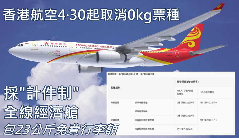 香港航空4·30起取消0kg票種 經濟艙包23kg免費行李額分享到: