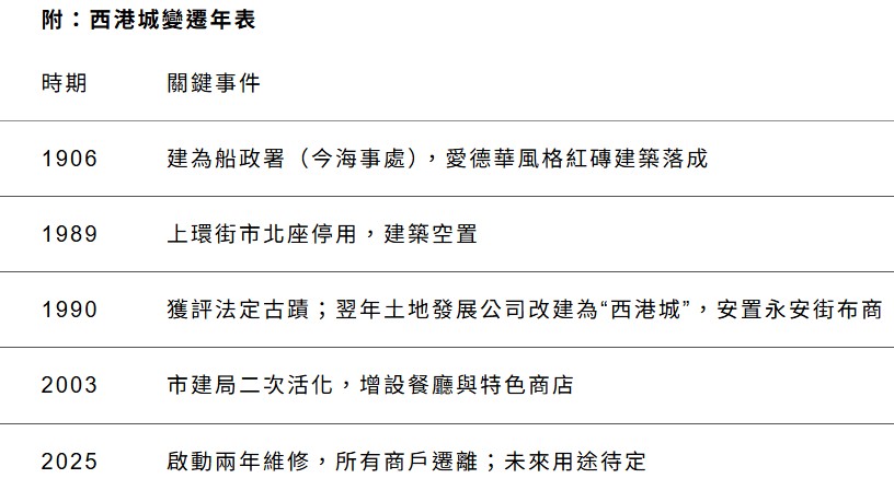 2025年5月25日,西港城地下商場迎來最後一個營業星期日。這座古蹟即將啟動大規模維修。5月30日,記者重訪西港城時,地下只剩4間店舖仍在營業。在西港城落戶逾30年的花藝店“Flora & 紫藤軒”江女士在清貨標籤前回憶:“1990年代這裡人頭湧湧,是香港的黃金時代。我由一個小舖做到三間相連舖,從未想過轉行。”她透露,市建局近年續約期由兩年縮短至兩個月,早已預示遷離結局。