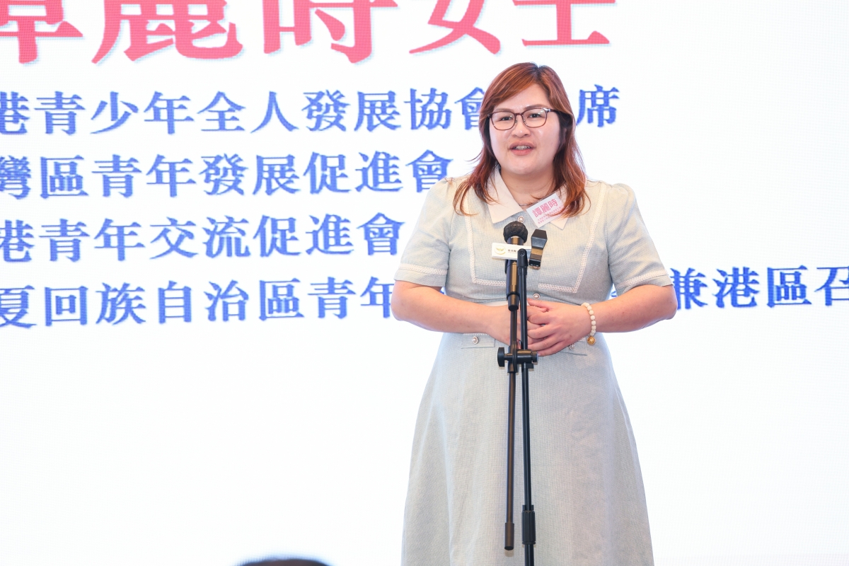 圖為香港青少年全人發展協會主席譚麗時為活動致開幕辭。 在分享環節上,參與學員分享了他們在交流期間的趣事,以及難忘的經歷。當中包括在寧夏與寧夏中學一同進行非遺藝術交流及共同協作完成非遺作品、在沒有光污染的寧夏哈巴湖當中學習及欣賞漫天星河,進行觀星課程的學習。