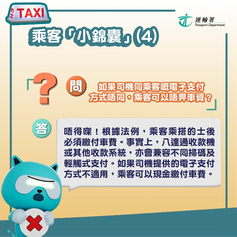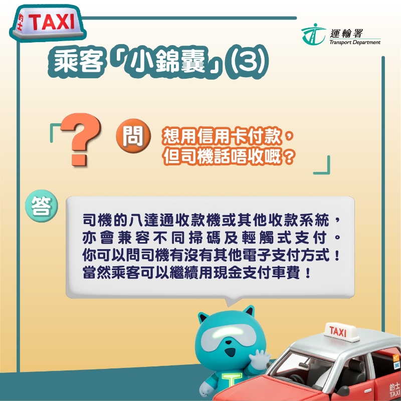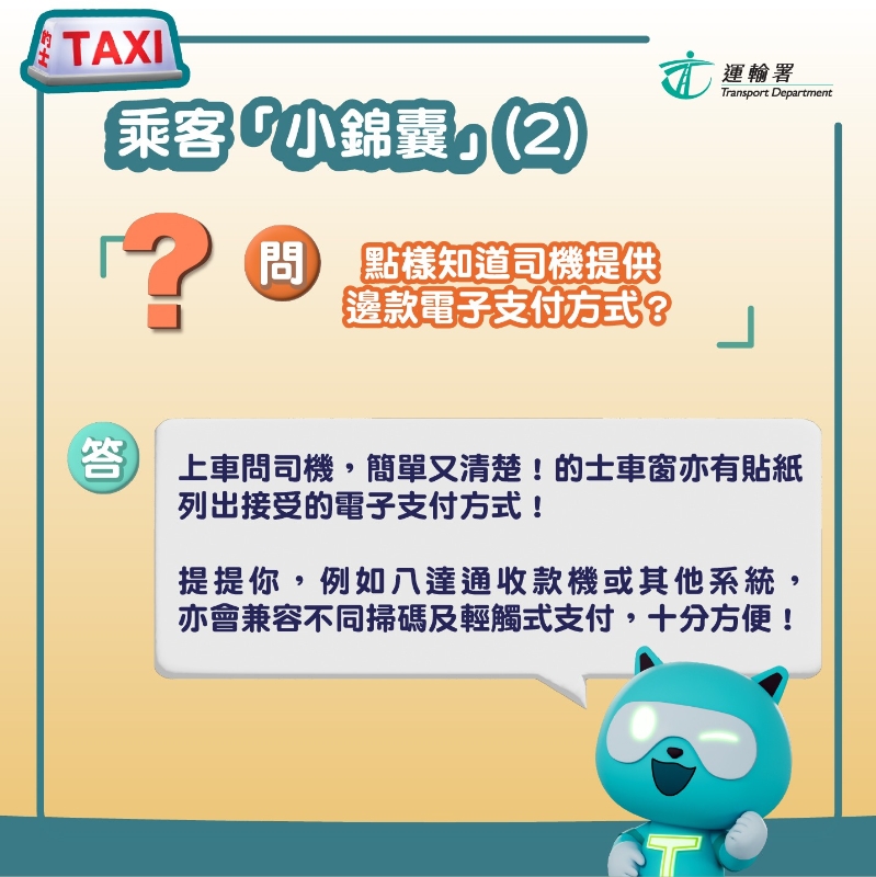 乘客上車前可查詢司機提供的電子支付方式,車窗亦會張貼相關標識。 逾4.7萬司機就緒 對遊客友好度大幅提升 香港特區政府運輸署助理署長馮惠筠昨日(3月31日)表示,的士業界已準備就緒,現有超過4.7萬名的士司機安裝了支援多種電子支付的系統。八達通透露,現有逾4萬名司機註冊商用版八達通App或配備八達通流動收款機,按年增加四成,交易額按年增六成半,並會繼續豁免的士司機交易手續費。 的士須提供電子支付一事獲不少香港市民點讚。市民許女士表示,此舉措確實帶來便利,並表示政府近年推行一系列措施規管的士,感受到的士服務質素有所提升,“始終有規管會更好,出行更加安心和便利”。市民張先生稱“電子支付方式是順應時代的好事,方便市民及旅客出行。”也有內地網友指出,來港後終於不用揣一堆港幣、到處找ATM、怕沒零錢被拒載,微信、支付寶直接掃碼,和內地打車一樣方便,不用額外換匯;同時電子支付有記錄,丟東西也更容易追溯。 香港旅遊發展局數據顯示,2025年全年訪港旅客數字約為4990萬人次,按年上升12%;其中內地訪港旅客約3780萬人次,按年增長約11%,佔全年訪港旅客量76%。非內地市場的旅客約有1210萬人次,同比增長15%。 訪港旅客人數持續攀升,便捷支付成為交通行業提升競爭力的關鍵。電子支付新規的實施,也是回應這一點。WeChat Pay HK公布,微信收錢碼支持人民幣及港幣收款,乘客以人民幣付款會自動兌換為港幣存入司機戶口,司機可免手續費隨時提款至香港銀行戶口,現時全港已有逾4萬的士司機開通相關服務。 香港運輸署提醒,乘客上車前可查詢司機提供的電子支付方式,車窗亦會張貼相關標識。若發現司機未提供電子支付,可記下日期、時間、車牌及司機資料,透過1823政府熱線或交通投訴組熱線2889 9999舉報。新例實施後,乘客仍可使用現金繳費,司機須備有不少於100元的鈔票及硬幣找贖,並必須接受現金付款。(完)