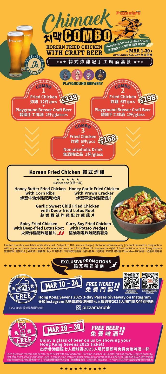 套餐中提供五種招牌韓式炸雞口味,從經典的蜂蜜牛油炸雞到蒜香甜辣炸雞,每一口都充滿濃郁的韓國風味。炸雞的外皮金黃酥脆,肉質鮮嫩多汁,搭配不同的醬汁,無論是單獨享用還是搭配啤酒,都是絕佳的選擇。 此套餐搭配的是Playground Brewery直送的韓國手工啤酒。這些啤酒不僅口感順滑,還利用當地新鮮原材料釀製,讓顧客在享用美食的同時,能夠品味到正宗的韓國啤酒文化。 此外,Pizza Maru還將舉辦Instagram有獎遊戲,讓食客有機會贏取香港國際七人欖球賽的三日通行證。參加者只需分享自己希望在賽後品嚐的菜式,並標註朋友,即可參加這個刺激有趣的活動。 在賽事期間,顧客更可於3月28日至30日,憑有效入場證在啟德店免費享用一杯Playground Brewery手工啤酒,搭配Pizza Maru的招牌芝加哥薄餅,讓美味升級。(完) 【編輯:黃璇】