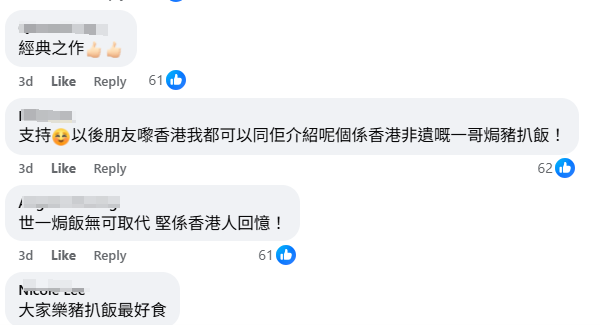 “焗豬扒飯”申請非遺的消息在社交平台上引起回響。(圖源:大家樂FB) 申遺消息在社交媒體引起討論,不少網民分享與焗豬扒飯的故事:“呢個味道,就係香港嘅味道!”(這個味道,就是香港的味道)、“以前返學Lunch必食,食足廿年都唔厭!”(以前上學午餐必吃,吃了二十年都不厭)、“支持,以後朋友來香港我都可以向他介紹這個是香港非遺的一哥焗豬扒飯”。 為爭取支持,大家樂推出多支廣告,重現焗豬扒飯的製作工序,並舉辦“全民集氣”活動,呼籲市民到社交平台點讚,更預告將推出限定優惠及街頭快閃活動,為申遺造勢。