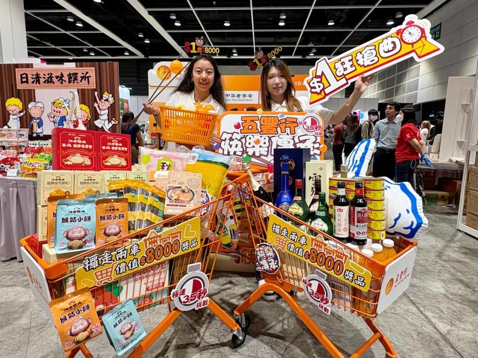 五豐行推出“1蚊夾波波”遊戲。 距離開幕不足一天,各家展商今(13日)正忙於布置攤位,準備迎接市民及遊客入場。五豐行於攤位外設置波波池,首8位入場者可參加“1蚊夾波波”遊戲,於35秒內以長筷夾球,即有機會贏取手推車及總值8000元的米、麵、油等禮品。該公司代表表示,參展主要為品牌宣傳,對生意有信心,已作充足準備。 另一品牌“龜益壽”推出限量10套1元35罐龜苓膏,並設有“買一送一”等快閃優惠,期望藉此推廣新品牌。負責人表示,雖然天文台預告未來數日天氣不佳,但受惠於會展有地鐵直達,即使下雨人流依然暢旺。