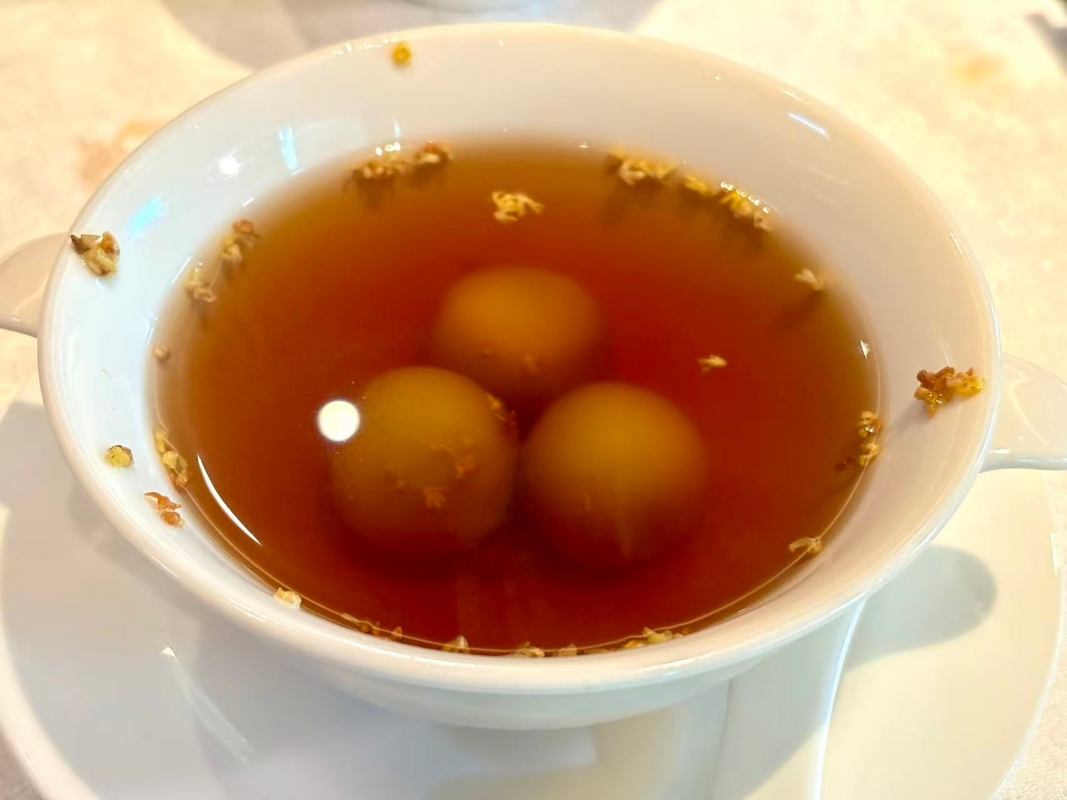 “桂花夠薑芝麻湯圓”以薑湯暖胃。(香港中通社記者 黃璇攝) “原隻蟹粉小籠包”是壓軸之一,皮薄餡厚,輕咬即有鮮美湯汁湧出,蟹香濃郁得恰到好處。最後端上的“桂花夠薑芝麻湯圓”以薑湯暖胃,芝麻餡柔滑香甜,桂花點綴,為一席蟹宴畫下溫潤句點。 這套“八味金秋宴”兩位起訂,菜式份量剛好,細膩而不過分張揚。記者離席時,嘴裡還留著蟹膏的鮮香,心裡也多了一份秋意江南的悠然。(完) 【編輯:黃璇】