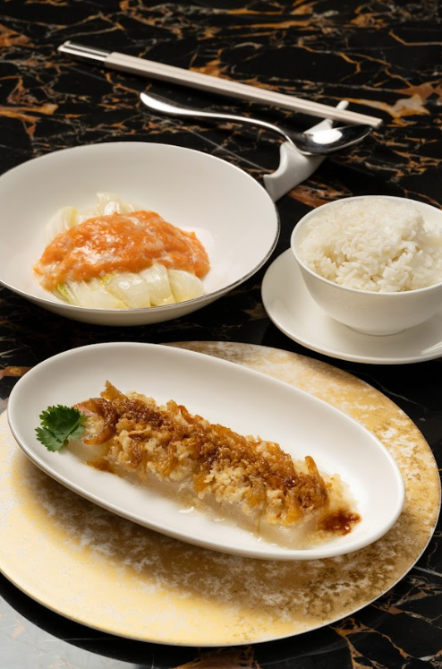 大地魚乾栗子炆豚肉粒,蒜香茄子配蛋炒飯。 大地魚乾栗子炆豚肉粒,蒜香茄子配蛋炒飯:以大地魚乾的獨特鮮味,搭配軟糯栗子與豚肉粒,為你帶來充滿家常風味的傳統菜式。 港式土魷蒸肉餅配XO醬炒雜菇配白米飯:將土魷的鹹香融入經典肉餅,配上香辣惹味的XO醬炒雜菇,呈現令人回味無窮的港式滋味。