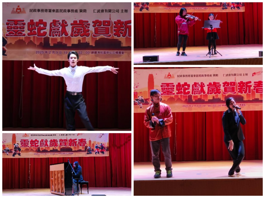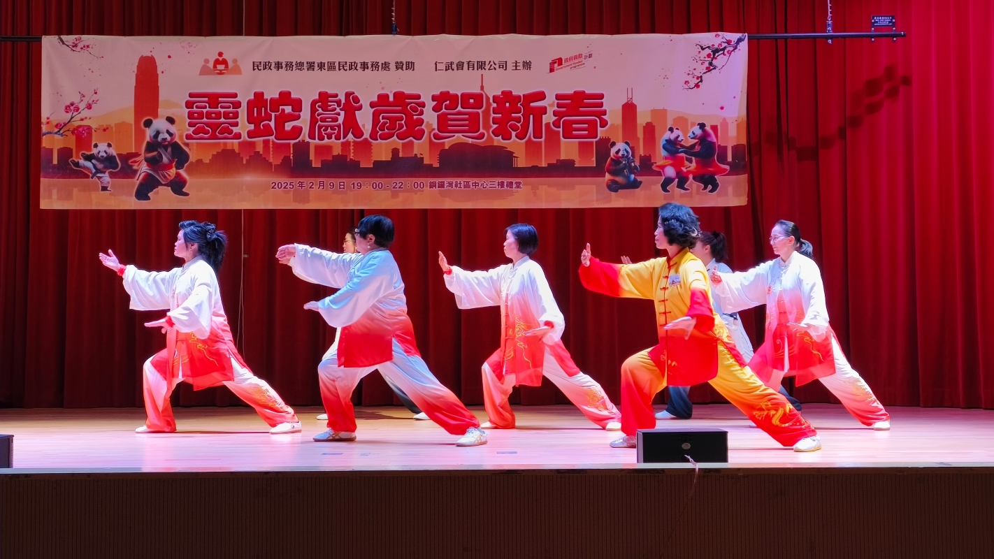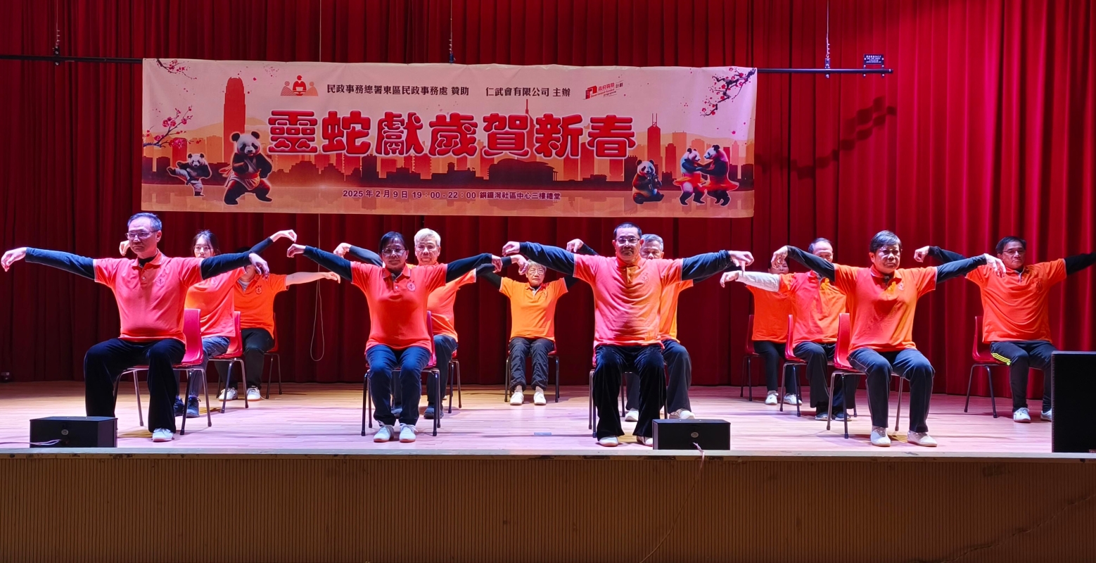武出健康太極協會的太極新編⼗三式 仁武會主席嚴義松致辭,他向大家送上新春祝福,祝大家蛇年身體健康,事事如意!並表示:仁武會做為一個慈善基金機構,成立十多年,過去幾年積極參與社區健康活動推廣,除了開辦各種健康講座,還委派教練到不同機構及社區進行免費教學,提高大眾的健康意識。今次活動更得到民政事務總署東區民政事務處提供的贊助,使仁武會得已舉辦成立以來的首次賀新春晚會,同東區市民同樂,共賀新春。 主禮嘉賓東區區議員洪志傑議員致辭:很榮幸受到仁武會邀請參加賀歲晚會,祝大家新年“靈蛇”健康、“靈蛇”快樂,他知道當晚節目非常豐富,有武術、舞蹈和演唱,可以做到“靈蛇”唱得、“靈蛇”打得、“靈蛇”睇得,並恭祝大家新年進步,萬事勝意!