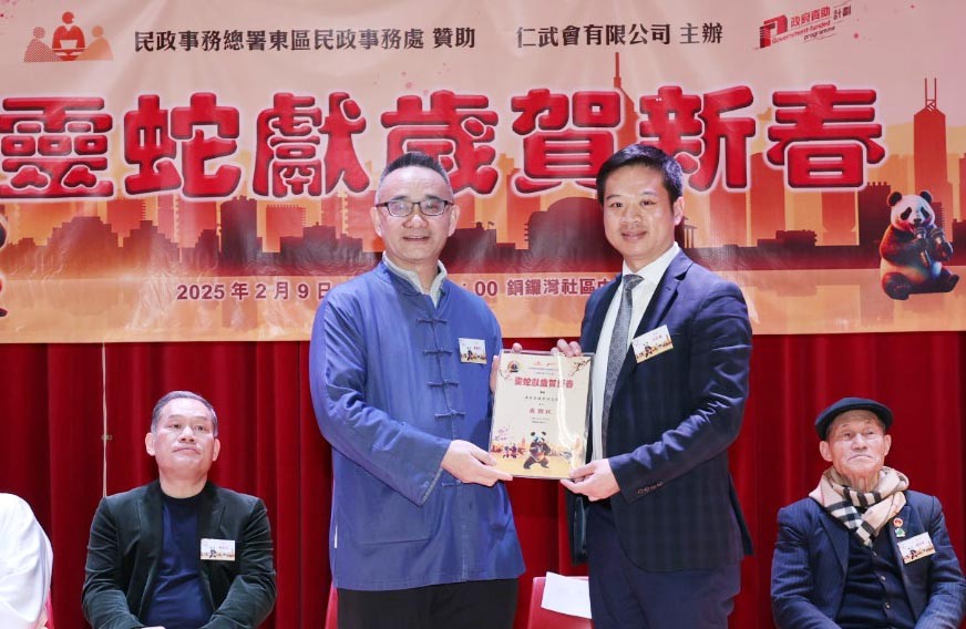 香港新聞網2月11日電 由香港仁武會主辦、民政事務總署東區民政事務處贊助的“靈蛇獻歲賀新春”2月9日晚假銅鑼灣社區會堂舉行,主禮嘉賓東區區議員洪志傑、香港閩清同鄉聯誼會會長黃挺光、漳州市武術協會副會長洪少葵、香港安溪同鄉會董事兼教練潘慧君、武出健康太極協會會長廖蘭香、長征藝術團團長趙汝彬、香港文善社創辦人楊淇煜、香港光澤聯誼會榮譽顧問蔡元芳及月兔信貸陳燕堂董事出席了活動。