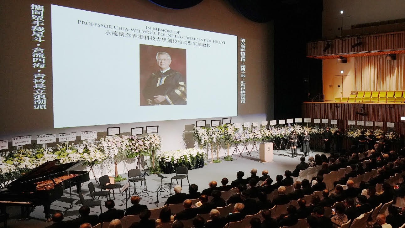 吳校長的太太和家人專門回港出席追思會。吳校長兒子吳德愷教授,聯同著名二胡演奏家、科大校友胡栢端及Cong四重奏,特別以中西合壁的方式,演繹他兒時親自為父親創作的樂曲,以體現吳校長對中西共融的理念。吳校長一眾孫女則獻唱《月亮代表我的心》,以歌聲送別摯愛的祖父。 期間,科大校董會主席沈向洋教授代表科大仝人致悼辭,校長葉玉如教授則致辭回顧吳校長的生平和貢獻,並聯同所有來賓一同默哀。科大團隊更利用AI技術,重塑吳校長於四本回憶錄中說過的話,讓校長於虛擬世界中“重現”,向眾人作最後道別。過去兩週,科大在校園內設立紀念堂,回顧吳校長對科大的重大貢獻,亦設有紀念網頁,供公眾表達敬意。(完) 【編輯:陳卓儀】