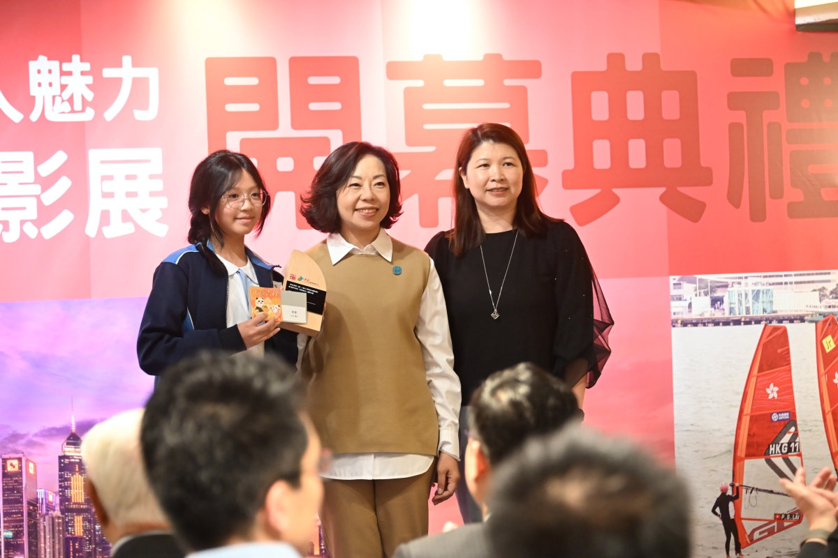 特區政府民政及青年事務局局長麥美娟女士為中學生攝影比賽冠軍梁洵傑頒獎