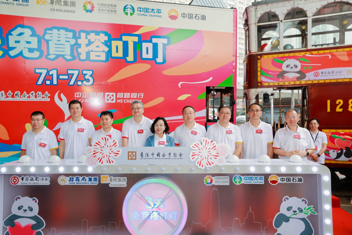 慶回歸28周年暨中企服務進社區活動 全港市民3天免費搭電車香港新聞網7月2日電 為慶祝香港回歸祖國28周年, 積極響應香港特區政府“拼經濟,謀發展,惠民生”的目標,在“全城慶祝、與眾同樂”的喜慶氣氛裏,香港中國企業協會攜手會員企業於7月1日開始一連3天(7月1日至3日)邀請全港市民免費搭乘香港電車,並於7月1日舉行電車免費搭乘活動啟動禮,與市民一起感受共慶回歸的喜悅氣氛,搭載香港夢想駛向未來。此慶祝活動由香港中國企業協會發起組織 ,與中旅集團、華潤集團、招商局集團、中國銀行(香港)、中國太平、中國石油等中資企業聯合主辦。 電車免費搭乘活動啟動禮1日在干諾道西屈地街電車總廠隆重舉行;由特區政府民政及青年事務局局長麥美娟女士,中聯辦港島工作部副部長尤斌先生,中企協會會長、中旅集團董事長王海民先生,中企協會副會長兼總裁于曉先生,中企協會副會長、華潤集團副總經理藍屹先生,中企協會副會長、招商局集團副總經理鄧仁杰先生,中企協會副會長、中銀香港副總裁王化斌先生,中企協會副會長、中國石油香港總經理蔣奇先生,中國太平保險集團領導焦艷軍先生擔任主禮嘉賓, 共同為活動主持啟動儀式。出席本次啟動禮的還有:光大集團副總經理,光大香港董事長兼總裁于法昌先生、中企協會副總裁曾燊典先生、灣仔區民政事務專員張雁伶女士、中企協會執董,燕山發展總經理曹欣先生、立法會議員嚴剛先生、陳振英先生、李浩然先生、姚柏良先生、陳沛良先生、簡慧敏女士、譚岳衡先生等。