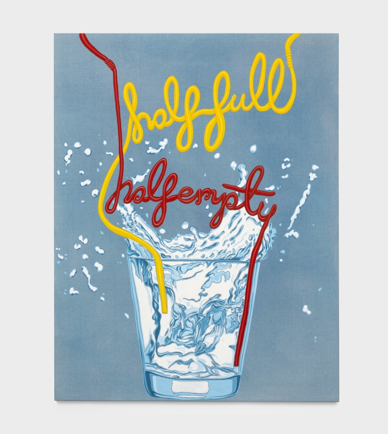 展覽海報 本場展覽將以藝術家標志性的圖文結合繪畫為形式範例,追溯梅斯勒的繪畫實踐,如創作於2020年的作品《無題(半滿半空)》,即為梅斯勒最典型的視覺表現。就像美國藝術家哈羅德 ·金頓著名的《牛奶滴冕》(1957年作)一樣,畫布捕捉到了運動中的液體在杯子中飛濺的情形;鮮明的黃色和紅色吸管則代表了樂觀與悲觀並存的心態。