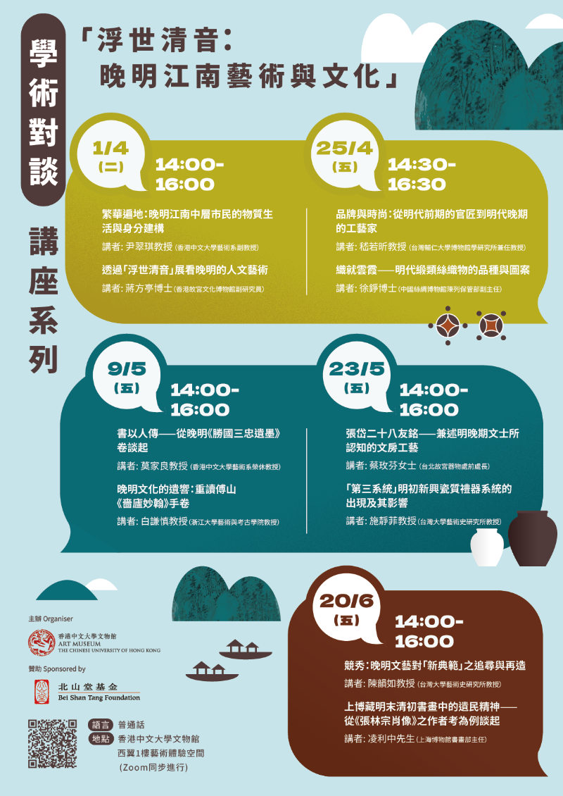 第一講 日期及時間:4月1日 下午2時至4時 主持人:鄧民亮(香港中文大學文物館副館長) 講者及講題: 尹翠琪(香港中文大學藝術系副教授) | 繁華遍地:晚明江南中層市民的物質生活與身分建構 蔣方亭(香港故宮文化博物館副研究員) | 透過“浮世清音”展看晚明的人文藝術 第二講 日期及時間:4月25日 下午2時30分至4時30分 主持人:童宇(香港中文大學文物館副研究員) 講者及講題: 嵇若昕(台灣輔仁大學博物館學研究所兼任教授) | 品牌與時尚:從明代前期的官匠到明代晚期的工藝家 徐錚(中國絲綢博物館研究館員) | 織就雲霞——明代緞類絲織物的品種與圖案 第三講 日期及時間:5月9日 下午2時至4時 主持人:何碧琪(香港中文大學文物館研究員) 講者及講題: 莫家良(香港中文大學藝術系榮休教授) | 書以人傳——從晚明《勝國三忠遺墨》卷談起 白謙慎(浙江大學藝術與考古學院教授) | 晚明文化的遺響:重讀傅山《嗇廬妙翰》手卷 第四講 日期及時間:5月23日 下午2時至4時 主持人:王冠宇(香港中文大學文物館中國器物主任) 講者及講題: 蔡玫芬(台北故宮器物處前處長) | 張岱二十八友銘——兼述明晚期文士所認知的文房工藝 施靜菲(台灣大學藝術史研究所教授) | “第三系統”明初新興瓷質禮器系統的出現及其影響 第五講 日期及時間:6月20日 下午2時至4時 主持人:司徒元傑(香港藝術館前首席研究員) 講者及講題: 陳韻如(台灣大學藝術史研究所教授) | 競秀:晚明文藝對“新典範”之追尋與再造 凌利中(上海博物館書畫部主任) | 上博藏明末清初書畫中的遺民精神——從《張林宗肖像》之作者考為例談起 現場參與:香港中文大學文物館西翼1樓藝術體驗空間(按此報名,名額有限,成功報名人士將收到電郵確認) 網上參與:Zoom(按此報名,成功報名人士將收到電郵確認及網上直播連結) 語言:普通話 【編輯:黃璇】