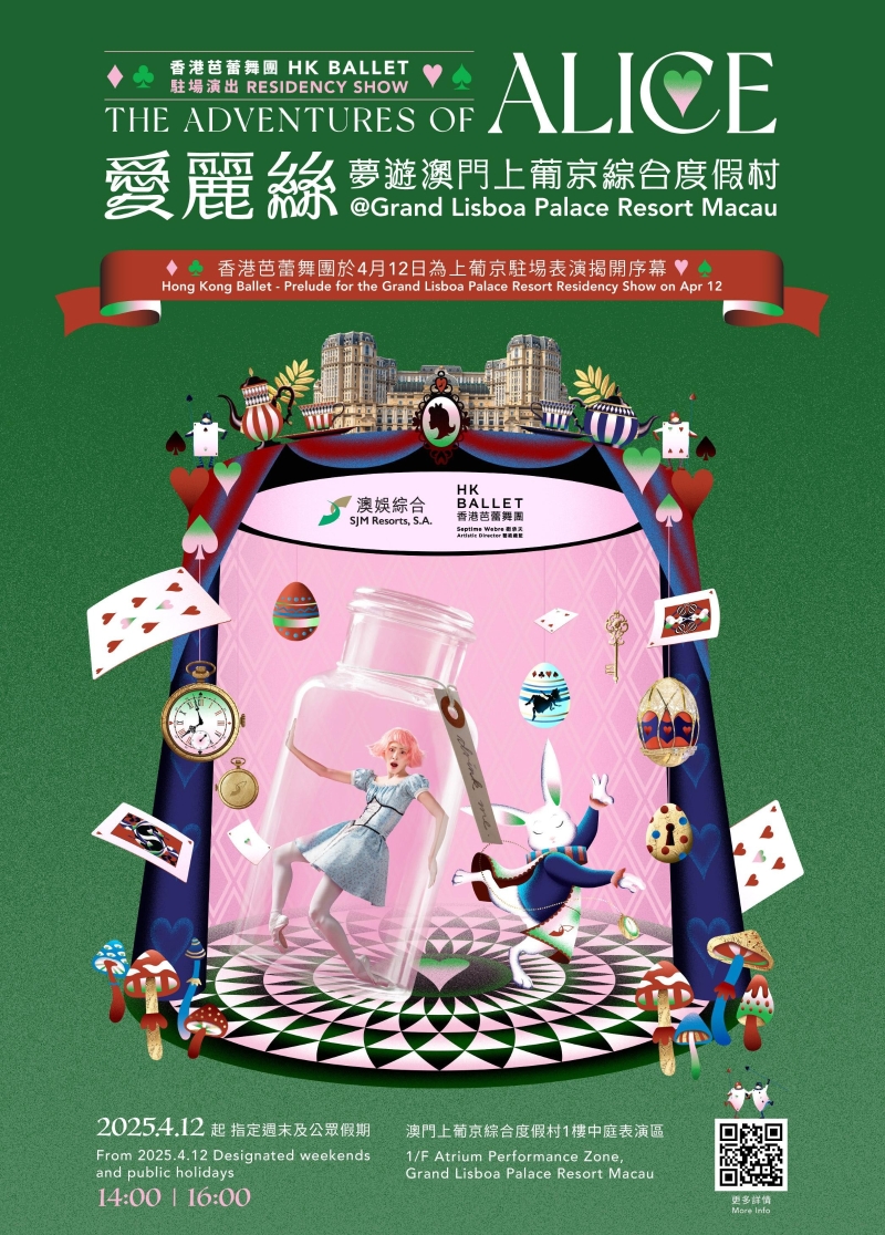 改編自港芭廣受好評的得獎芭蕾舞劇《愛麗絲夢遊仙境》,這齣廣受好評的製作於香港、北京、新加坡和美國演出皆引起熱烈迴響。是次全新的駐場演出由港芭藝術總監衛承天(Septime Webre)編舞及執導,由港芭舞者、澳門及大灣區的優秀舞者攜手演繹。演出把古典芭蕾與當代舞蹈巧妙融合,搭配由獲獎作曲家伍卓賢精心炮製的奇趣音樂和太陽劇場設計師莉茲.凡達爾操刀的時尚服飾,以及全景舞台、先進燈光、音響及投影技術,將在上葡京一樓中庭把這個深受大眾喜愛的童話故事以嶄新視角呈現,為不同年齡層的觀眾帶來非凡的愛麗絲世界。觀衆更可在演出前觀賞舞團的公開熱身課,一睹舞者在舞台上的準備過程,近距離感受到芭蕾舞帶來的熱情與活力。