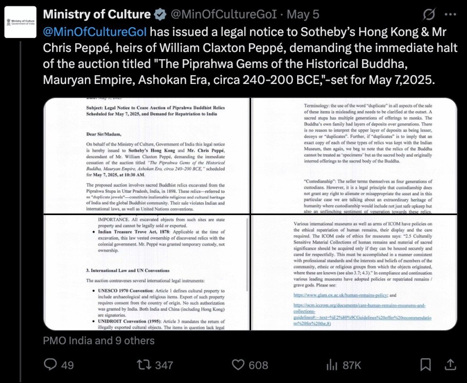 印度文化部發布聲明指此次拍賣違反國際法與聯合國公約。(圖源:X) 印度文化部於社交媒體平台X上的聲明指出,佩沛家族僅被授予“臨時保管權”(temporary custody),而非擁有這批剩餘佛寶聖物的所有權(ownership)。信中亦指,這些文物是印度乃至世界佛教“不可剝奪的宗教和文化遺產”,是佛陀神聖遺物不可或缺的一部分,不能被商品化,而出售行為違反了國際法以及聯合國公約。 據英國《衛報》報道,除了印度政府,此次拍賣早前亦引起眾佛教學者及寺院住持的強烈反對。倫敦大學亞非學院教授Ashley Thompson表示,對於絕大多數信徒來說,這些寶石並非無生命的物品——它們蘊含著佛陀的一部分存在,而出土時將骨灰與供物分開,一部分供物如今更將被出售,這樣的行為是在“延續分離的殖民暴力”。 而今次拍賣的委託人、威廉·佩沛的曾孫克里斯·佩沛(Chris Peppé)則回應表示“這些論點不代表佛教的流行觀點”,他稱過去十年間諮詢的佛教寺廟及專家,均不認為這些寶石是佛陀遺體的一部分。而他亦曾嘗試過將這些寶石捐贈給寺廟或者博物館,但事實證明這存在很多問題,故而認為拍賣這一舉措是將這些文物移交給佛教徒“最公平、最透明”的方式。 蘇富比發言人早前曾表示他們對這批佛寶“進行了必要的盡職調查”,指拍賣將按時進行。而今日上午蘇富比回應稱,基於印度政府提出的問題,他們經委託人同意後決定將拍賣推遲,供各方進行討論。查閱蘇富比官網顯示,拍賣具體時間安排已於日程官網拍賣日程中取消,詳情頁亦同步下架。(完) 【編輯:黃璇】