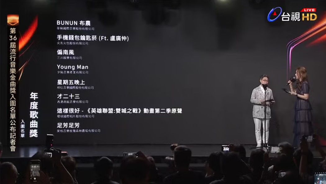 最佳年度歌曲獎入圍名單。(直播截圖) 《BUNUM布農》華納國際音樂股份有限公司 《手機錢包鑰匙菸》火玄火包股份有限公司 《偏南風》三川娛樂有限公司 《Young Man》夕陽音樂產業有限公司 《星期五晚上》相信音樂國際股份有限公司 《才二十三》香港商鳳音樂有限公司 《這樣很好》環球國際唱片股份有限公司 《足芳足芳》果核音樂玫瑰森林農場有限公司 最佳新人獎 入圍名單