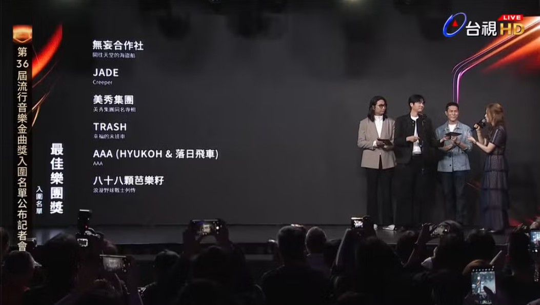 最佳樂團獎入圍名單。(直播截圖) 無妄合作社《開往天堂的海盜船》 JADE《Creeper》 美秀集團《美秀集團同名專輯》 TRASH《幸福的末班車》 AAA《AAA》 八十八顆芭樂籽《浪漫野球戰士列傳》 最佳作曲人獎 入圍名單
