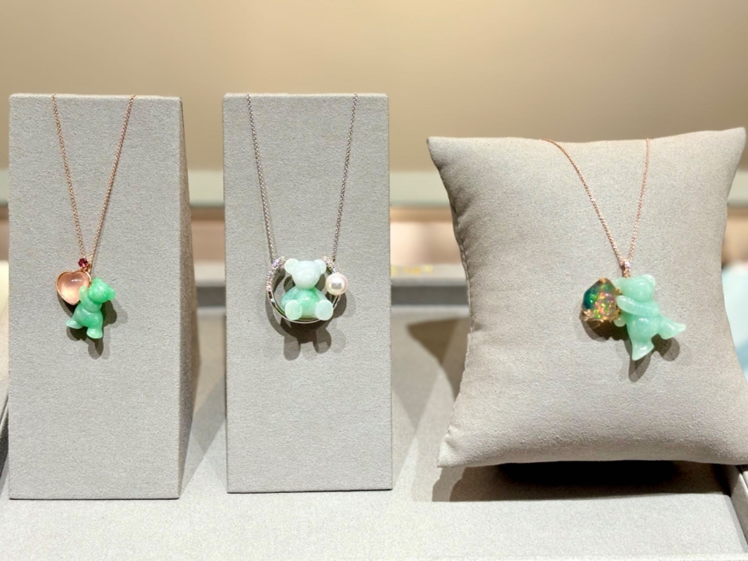 《陪伴玉熊》系列珠寶設計靈感來自林曉同為女兒一歲生日所贈的布偶熊。(香港中通社記者 黃璇攝) 《陪伴玉熊》系列珠寶設計靈感來自林曉同為女兒一歲生日所贈的布偶熊。多年來,小熊靜靜守候在床邊,陪伴女兒成長。這段無聲的父愛,透過玉雕被溫柔訴說,成為一件“可佩戴的情感藝術”。