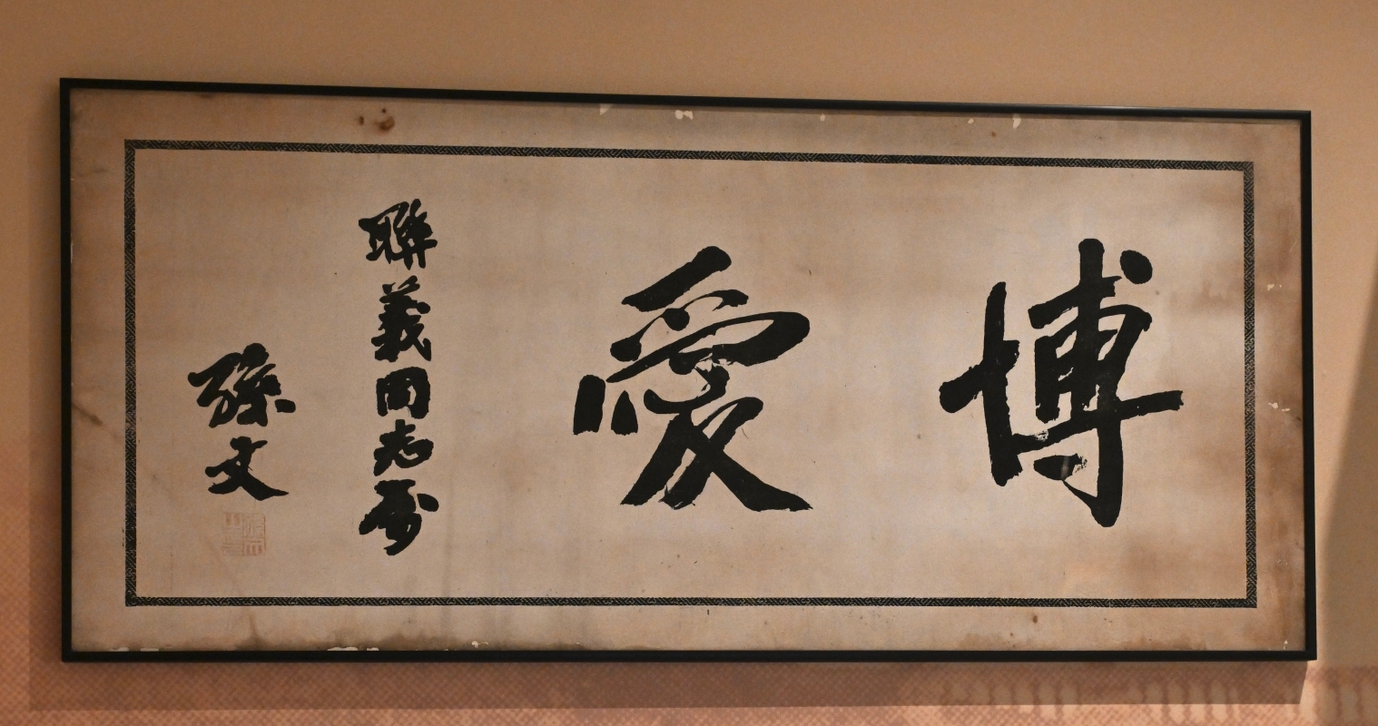 孫中山題贈給香港海員的“博愛”條幅。 展覽展出逾60件珍貴文物、文獻和歷史照片,重點展品包括“博愛”條幅、孫中山與“四大寇”在香港合照的玻璃底片、澳門同盟會會所的歷史照片、以及香港大學邀請孫中山參加開學典禮的信函等。此外,還有孫中山在廣州擔任陸海軍大元帥的令文及紀念孫中山的中山艦航海鐘等珍品。