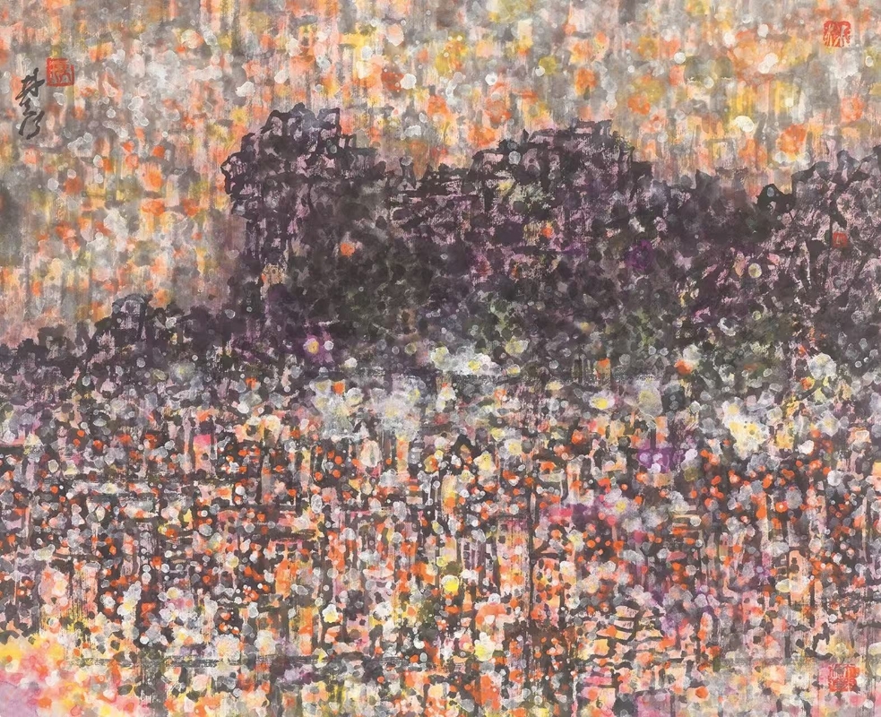 祖國頌畫面飽滿沒有留白。“夜 ·香港”畫展官方發佈 上世紀80年代初,林天行機緣巧合移民香港,當時以為香港是天堂,最適合愛作夢的藝術家,初來乍到語言不通、寄居親戚家中,更要在塑料花工廠打工養活自己,一年後辭職踐行自己的理想。他走遍香港的書店,像海綿一樣吸允著繪畫的理論養分,並不斷實現自己的創新價值。1987年,他終於走進中央美術學院深造並提升自己的繪畫造詣。他說,自己的畫風屬於現實主義,但有所創新,特別是在陝北寫生時,那種大地蒼茫、莊稼色彩、山水別樣,都為作品帶來顛覆性靈感。
