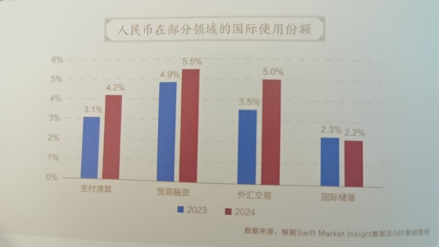 調查亦指,人民幣的國際職能進一步增強。根據SWIFT報文數據和IMF數據,2024年人民幣在支付清算、貿易融資、外匯交易、外匯儲備中的使用份額分別為4.2%,5.5%和5%和2.2%,總體較2023年有不同程度提升。按份額衡量,人民幣為全球第四大支付貨幣、第三大貿易融資貨幣、第五大外匯交易貨幣,第七大儲備貨幣。(完) 【編輯:譚暢】