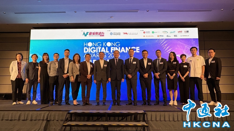 •   7月4日,香港特區財經事務及庫務局局長許正宇(右八)出席香港數字金融大獎2025頒獎典禮時,與新城廣播有限公司董事總經理宋文禧(左八)、新城廣播有限公司首席營運總監馬浚偉(右七)及得獎者合照。 香港中通社圖片