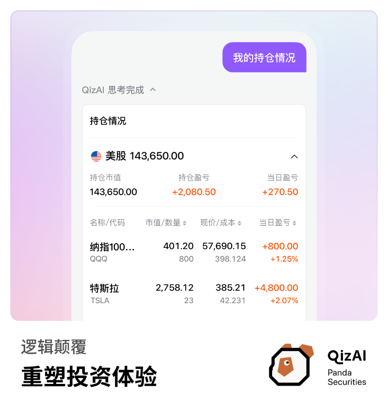 除交易功能外,QizAI還提供全面的信息支持服務,涵蓋財經百科、公司基本面、實時行情、財報分析等多維度內容。依託強大的數據處理與分析能力,QizAI能夠從海量市場信息中精准提煉關鍵數據,並以清晰易懂的方式呈現給客戶,幫助投資者在複雜多變的市場環境中快速把握動態,做出更明智的決策。 伴隨著人工智能的迅速崛起和發展,從智能家居到智慧交通,從醫療教育到金融服務,科技的力量不斷推動社會向更高效、更便捷的方向發展,為人類的未來開啓了一扇更加智能化的大門。 在證券領域,QizAI的出現標誌行業著服務模式的重大變革,其智能化和人性化的特點,不僅提升了客戶體驗,也為行業發展提供了新思路。相信,隨著AI技術的不斷成熟,證券服務將變得更加智能、高效和包容,而熊貓證券無疑將在這一進程中扮演重要角色。未來,熊貓證券將繼續深耕AI技術的應用場景,探索智能服務的更多可能性,為全球投資者創造更優質、更個性化的智能化服務解決方案。(完) 【編輯:徐嘉儀】