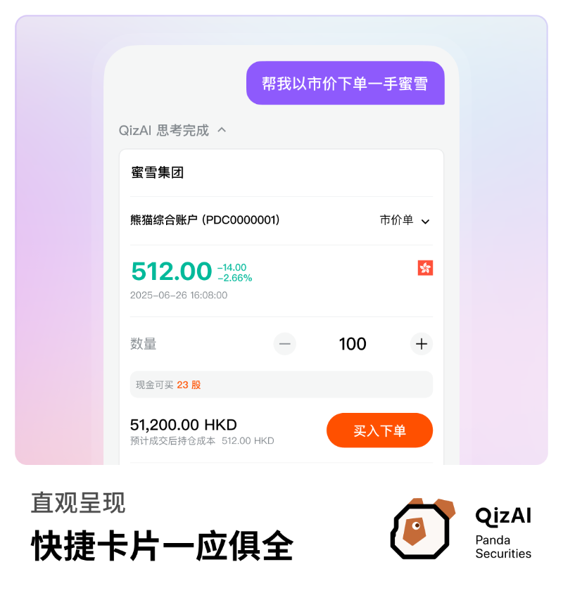 在AI重塑證券業的過程中,證券行業的服務模式正經歷從傳統人工客服向智能助手的跨越式升級。一直以來,熊貓證券長期專注於極速交易執行與智能交互體驗,並將這兩大核心技術深度融合,致力於為客戶提供更高效、更便捷的服務。QizAI的誕生,正是熊貓證券通過工程創新降低專業投資門檻的重要成果,其高可控性、易用性的特點,為全球投資者提供了更智能的解決方案。這一人工智能產品的成功問世,離不開熊貓證券在低延遲技術與自然語言交互領域的持續投入,以及與客戶共同驗證技術價值的發展紅利。
