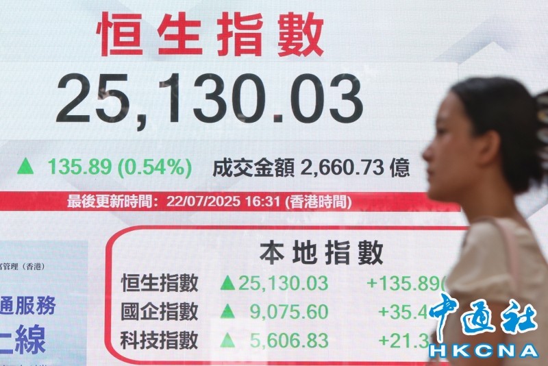 香港中通社7月22日電(記者梁嘉軒)港股22日表現向好,恒指升穿25000點並以全日高位25130點收市,升135點或0.5%,創逾3年半以來最高。大市成交額2660.73億港元。