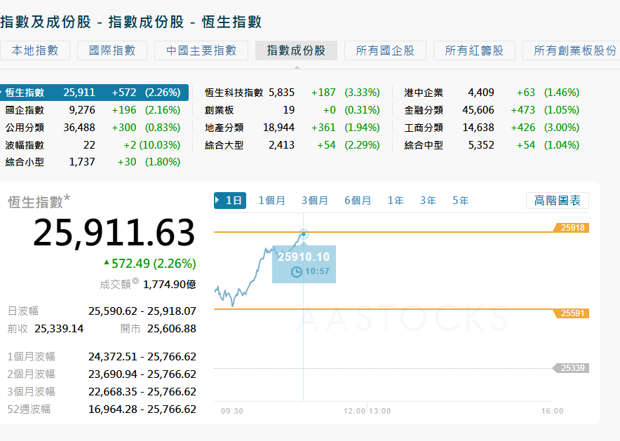 恒指高開267點,其後升幅逐步擴大,於早上10時57分,恒指報25911點,升572點或2.26%。