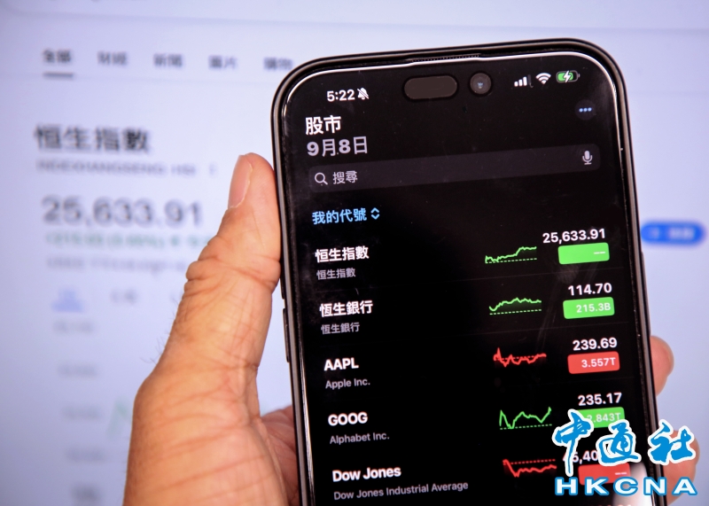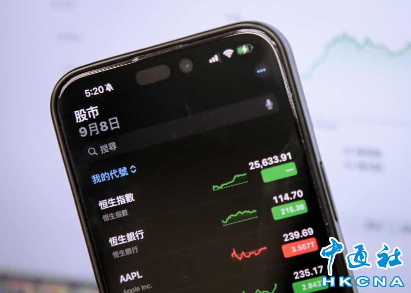 •   9月8日,香港恒生指數收報25,633.91點,升215點,升幅0.85%,連升兩日,創兩星期收市新高(香港中通社記者 徐文峰攝) 香港中通社圖片