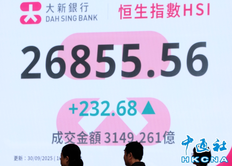 •   9月30日,香港恒生指數漲232.68點,漲幅0.87%,報26855.56點,主板全天成交3149.261億港元。(香港中通社 鄧梓傑攝) 香港中通社圖片