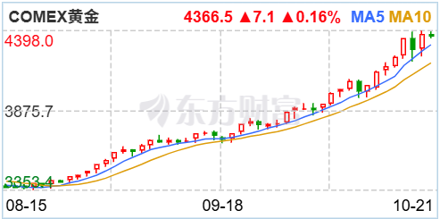 香港新聞網10月21日電 現貨黃金周一(20日)再創歷史新高!黃金在上周五衝高回落後重拾升勢,現貨黃金突破前高,盤中一度漲超3%,最高報4381.49美元/盎司,最終收盤漲2.46%,報4355.69美元/盎司;COMEX黃金期貨漲3.82%,報4374.30美元/盎司。今天亞市早盤,現貨黃金高位震蕩,目前交投於4360美元/盎司附近。