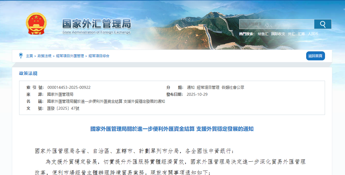 香港中通社10月29日電  據中國國家外匯管理局29日消息,該局日前發布《國家外匯管理局關於進一步便利外匯資金結算 支持外貿穩定發展的通知》(以下簡稱《通知》),以支持外貿穩定發展,切實提升外匯服務實體經濟質效。