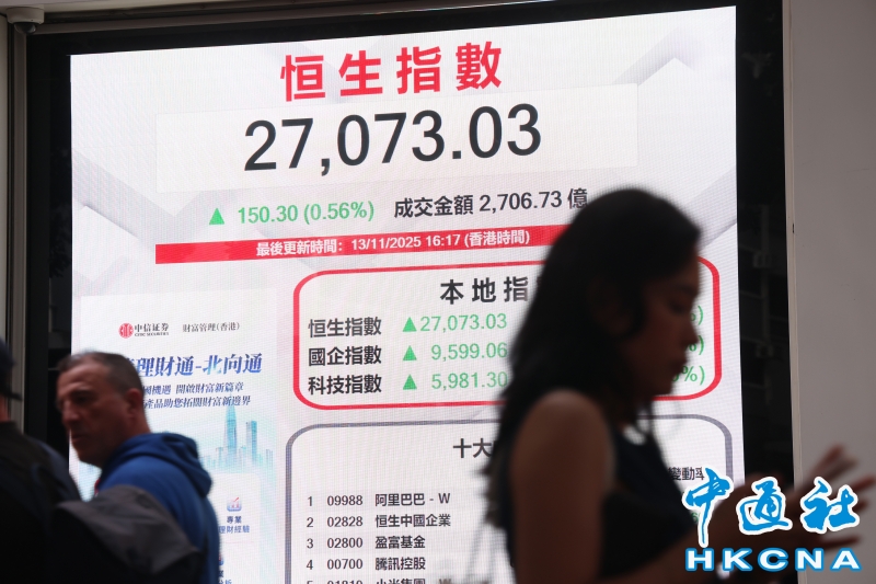 •   11月13日,截止收盤,香港恒生指數漲150.30點,漲0.56%,報27073.03點,主板全日成交2706.73億港元。(香港中通社  鄧梓傑 攝) 香港中通社圖片